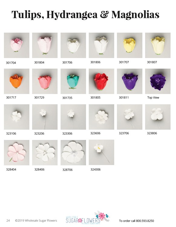 Tulips, Hydrangea & Magnolias 301804 301706 301806 301707 301807 301704 301717 301729 301735 301805 301811 Top View 323106 323206 323306 323606 323706 323806 To order call 800.593.8250 328404 328406 328706 324306 ©2019 Wholesale Sugar Flowers 24