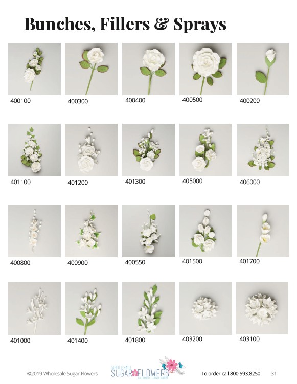 Bunches, Fillers & Sprays 400100 400300 400400 400500 400200 401100 401200 401300 405000 406000 400800 400900 400550 401500 401700 401000 401400 401800 403200 403100 To order call 800.593.8250 ©2019 Wholesale Sugar Flowers 31