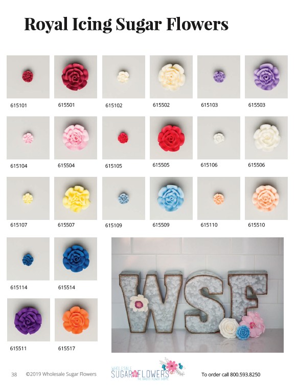 Royal Icing Sugar Flowers 615501 615102 615502 615103 615503 615101 615104 615504 615105 615505 615106 615506 615107 615507 615109 615509 615110 615510 To order call 800.593.8250 615114 615514 615511 615517 ©2019 Wholesale Sugar Flowers 38