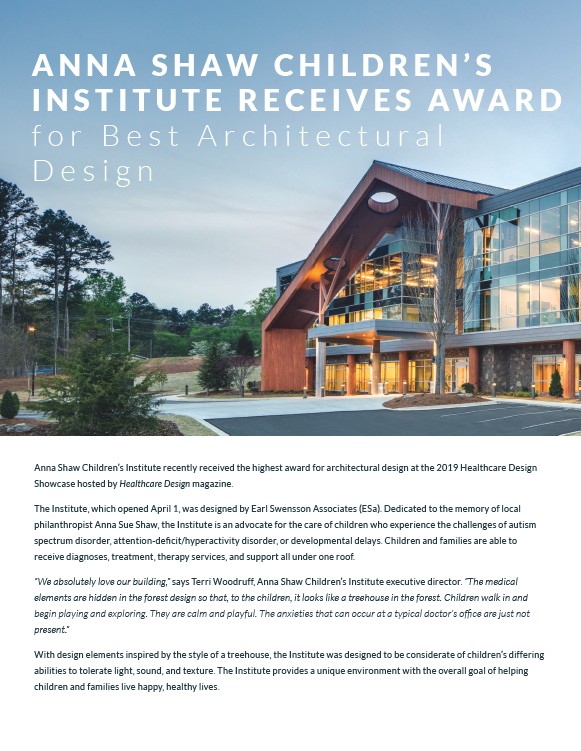 Anna Shaw Children’s Institute recently received the highest award for architectural design at the 2019 Healthcare Design