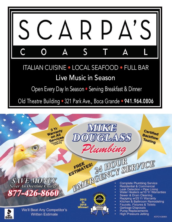 ITALIAN CUISINE • LOCAL SEAFOOD • FULL BAR Live Music in Season Open Every Day In Season • Serving Breakfast & Dinner Old Theatre Building • 321 Park Ave., Boca Grande • 941.964.0806