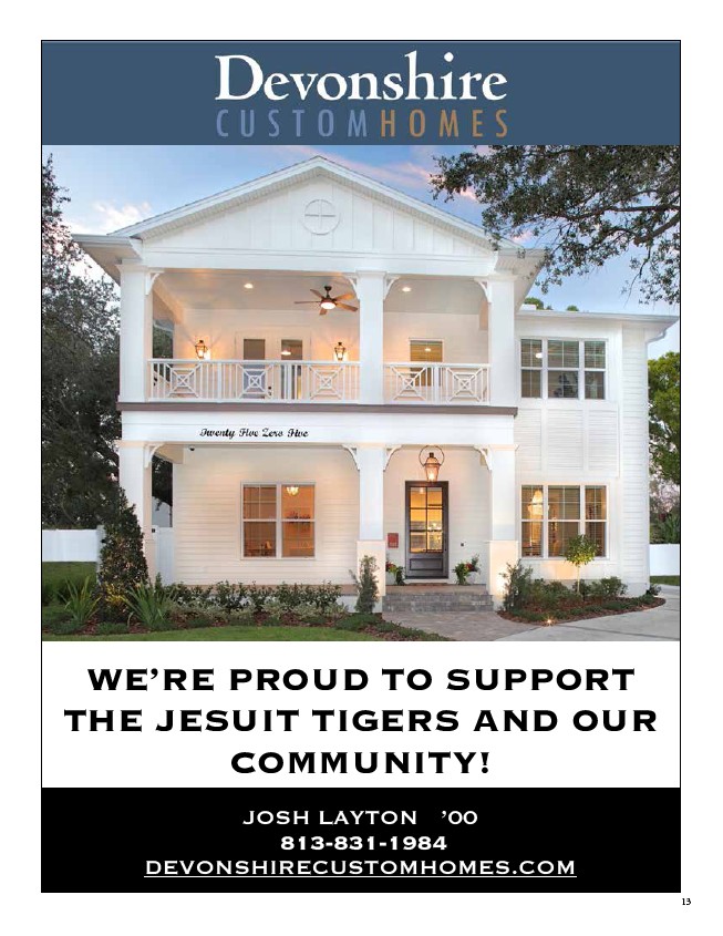 WE’RE PROUD TO SUPPORT THE JESUIT TIGERS AND OUR COMMUNITY! JOSH LAYTON ’00 813-831-1984 DEVONSHIRECUSTOMHOMES.COM 13