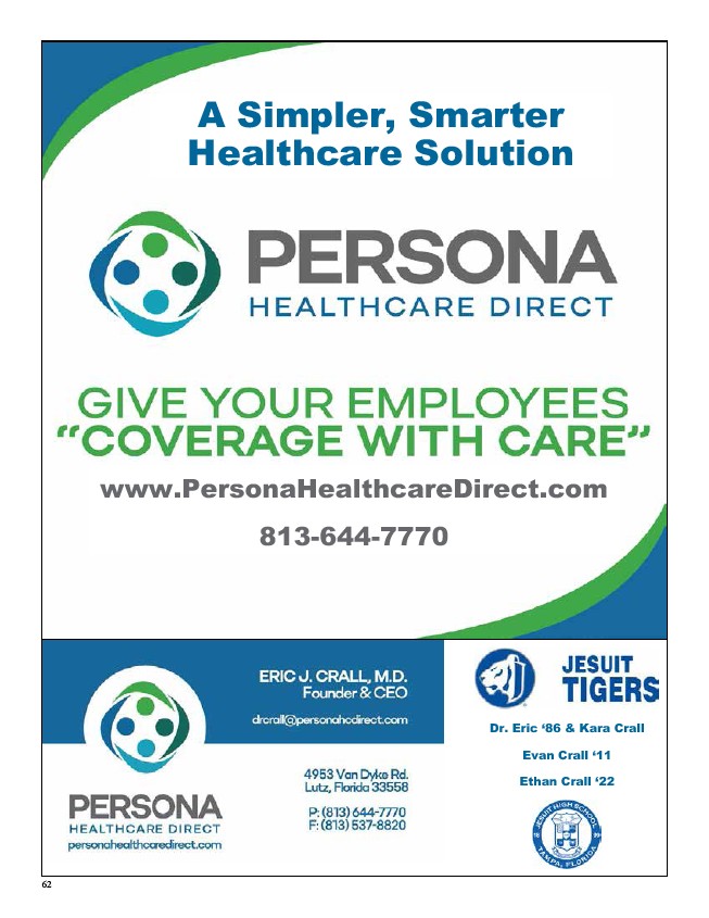 62 www.PersonaHealthcareDirect.com 813-644-7770 Dr. Eric ‘86 & Kara Crall Evan Crall ‘11 Ethan Crall ‘22 A Simpler, Smarter Healthcare Solution