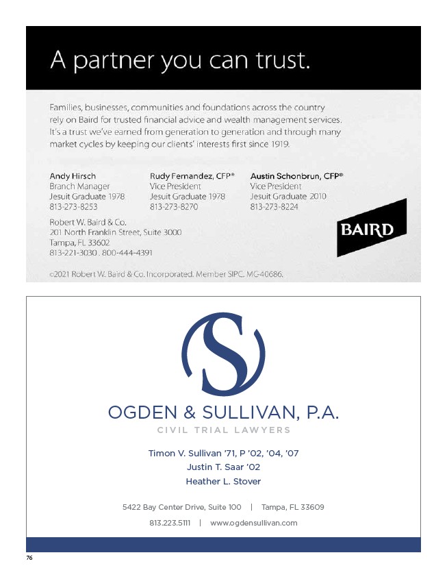 OGDEN & SULLIVAN, P.A. C I V I L T R I A L L A WYERS Timon V. Sullivan ’71, P ’02, ’04, ’07 Justin T. Saar ’02 Heather L. Stover 5422 Bay Center Drive, Suite 100 | Tampa, FL 33609 813.223.5111 | www.ogdensullivan.com 76