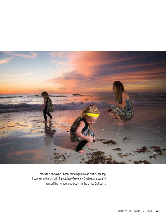 FEBRUARY 2018 | SARASOTA SCENE 67 Family fun on Siesta Beach, once again voted one of the top beaches in the world in Trip Advisor’s Travelers’ Choice Awards, and ranked the number one beach in the US by Dr. Beach.