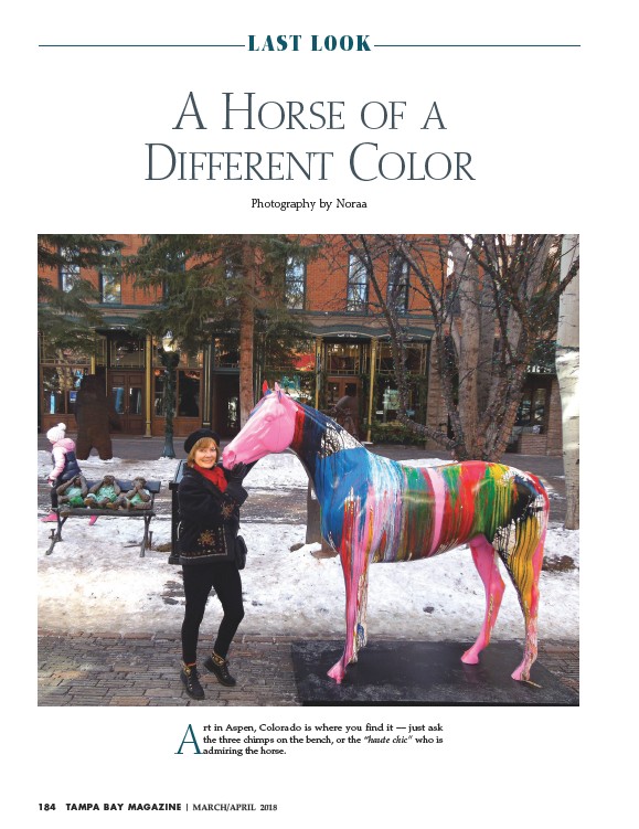 LASTA RLTOOK A HORSE OF A DIFFERENT COLOR Photography by Noraa A rt in Aspen, Colorado is where you find it –– just ask the three chimps on the bench, or the “haute chic” who is admiring the horse. 184 TAMPA BAY MAGAZINE | MARCH/APRIL 2018