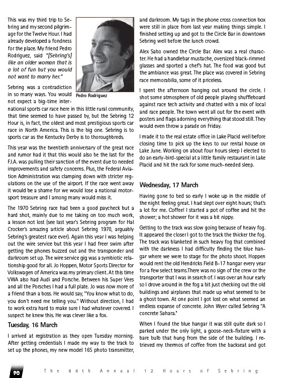 “Sebring’s like an older woman that is a lot of fun but you would not want to marry her.” This year was the twentieth anniversary of the great race Tuesday, 16 March Wednesday, 17 March Pedro Rodriguez 90