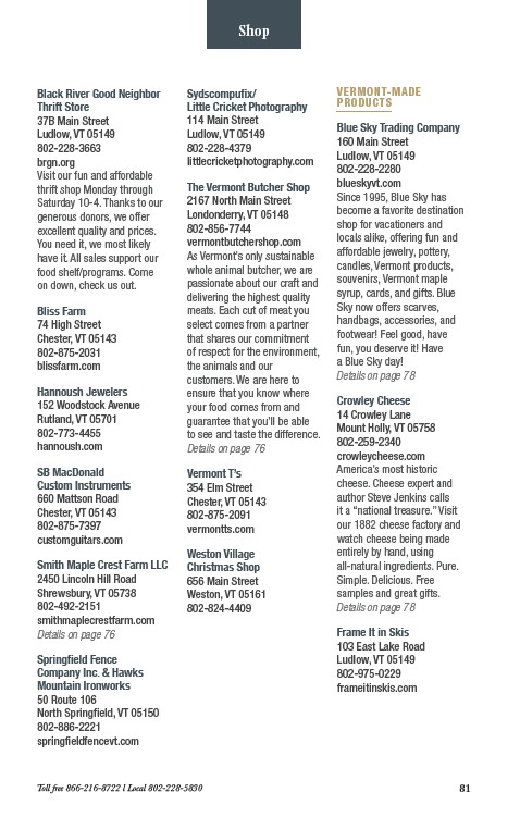Toll free 866-216-8722 l Local 802-228-5830 81