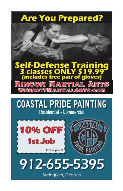 Rincon Martial Arts WescottMartialArts.com COASTAL PRIDE PAINTING Residential - Commercial 10% OFF 1st Job MrCoupon ® 912-655-5395 Springfield, Georgia