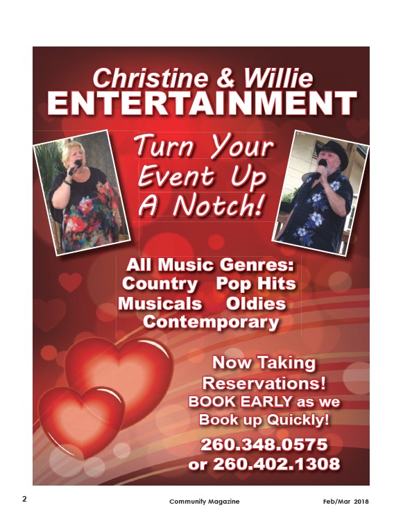 Christine & Willie ENTERTAINMENT Turn Your Event Up A Notch! All Music Genres: Country Musicals Pop Hits Oldies Contemporary Now Taking Reservations! BOOK EARLY as we Book up Quickly! 260.348.0575 or 260.402.1308 2 Community Magazine Feb/Mar 2018