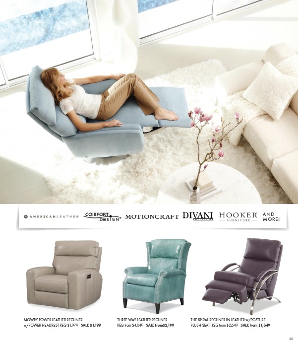 25 AND MORE! MOWRY POWER LEATHER RECLINER w/POWER HEADREST REG $1,979 SALE $1,199 THREE WAY LEATHER RECLINER REG from $4,049 SALE from$2,199 THE SPIRAL RECLINER IN LEATHER w/POSTURE PLUSH SEAT REG from $2,649 SALE from $1,849
