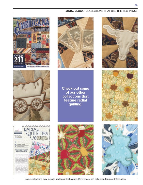 89 RADIAL BLOCK - COLLECTIONS THAT USE THIS TECHNIQUE Check out some of our other collections that feature radial quilting! Some collections may include additional techniques. Reference each collection for more information.
