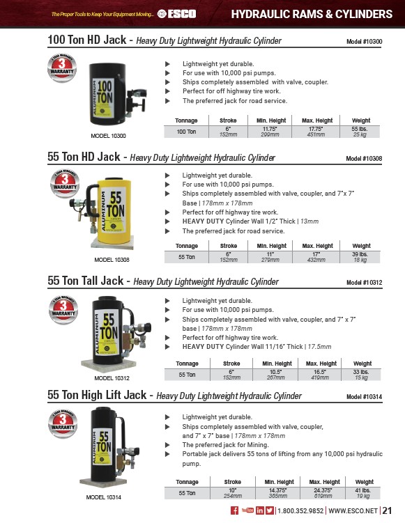 55 Ton High Lift Jack - Heavy Duty Lightweight Hydraulic Cylinder Model #10314