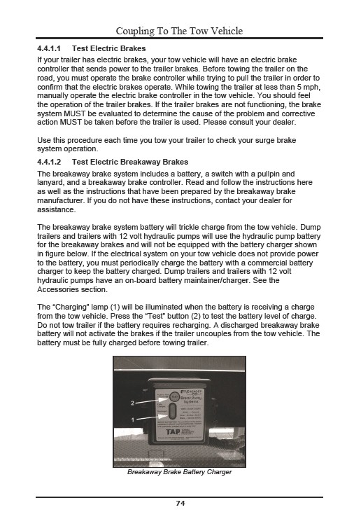 from the tow vehicle. Press the “Test” button (2) to test the battery level of charge.