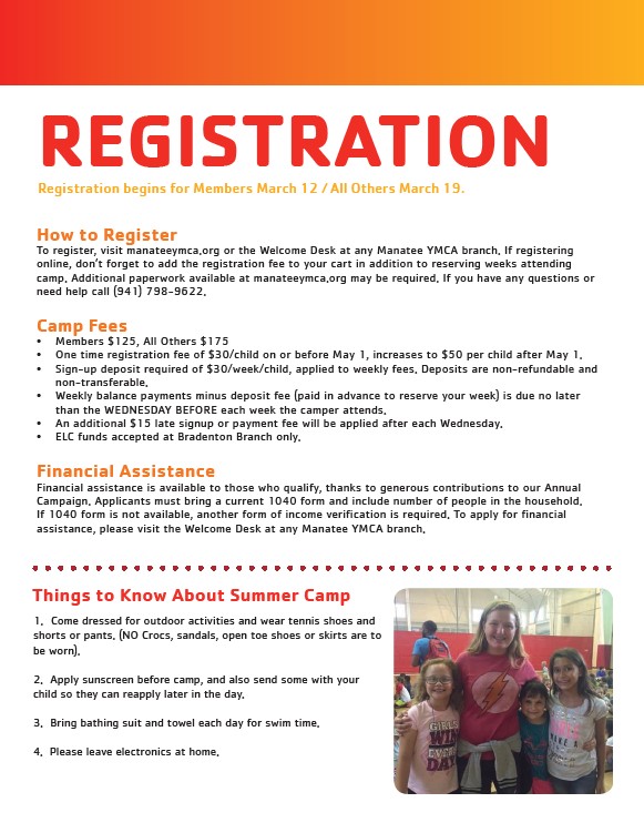 To register, visit manateeymca.org or the Welcome Desk at any Manatee YMCA branch. If registering