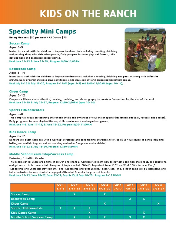 “Leadership and Character Devlopment,” and “Leadership and Goal Setting.” Each week-long, 3-hour camp will be interactive and
