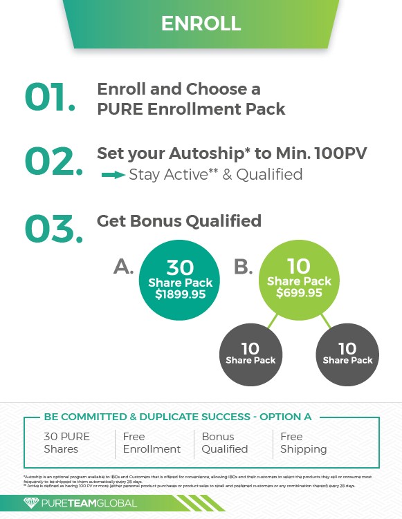ENROLL 01. Enroll and Choose a PURE Enrollment Pack 02. Set your Autoship* to Min. 100PV 03. BE COMMITTED & DUPLICATE SUCCESS - OPTION A Shares Free Enrollment Free