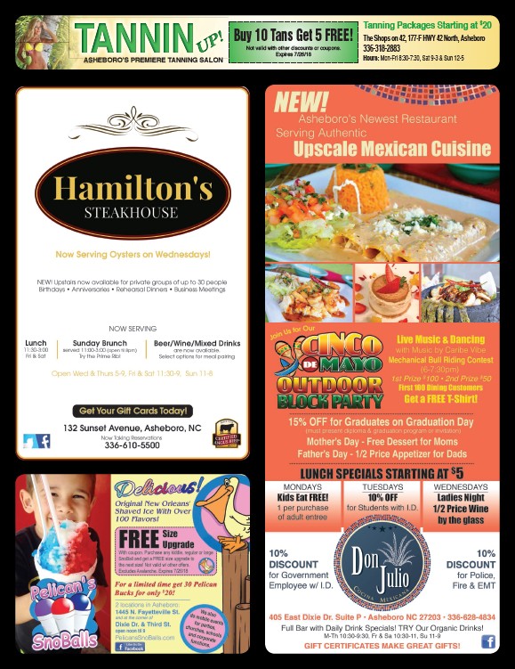 Tanning Packages Starting at $20 The Shops on 42, 177-F HWY 42 North, Asheboro 336-318-2883 Buy 10 Tans Get 5 FREE! Not valid with other discounts or coupons. Expires 7/26/18 Hours: Mon-Fri 8:30-7:30, Sat 9-3 & Sun 12-5