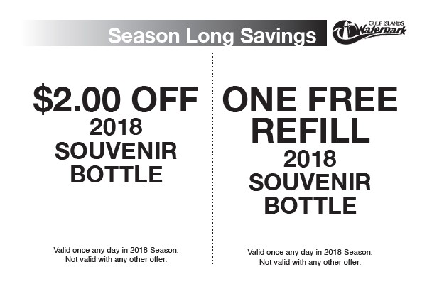 Season Long Savings $2.00 OFF 2018 SOUVENIR BOTTLE Valid once any day in 2018 Season. Not valid with any other offer. ONE FREE REFILL 2018 SOUVENIR BOTTLE Valid once any day in 2018 Season. Not valid with any other offer.