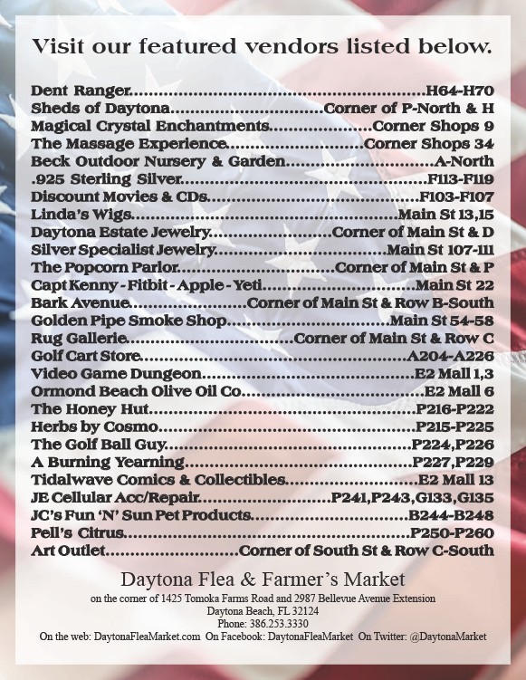 On the web: DaytonaFleaMarket.com On Facebook: DaytonaFleaMarket On Twitter: @DaytonaMarket