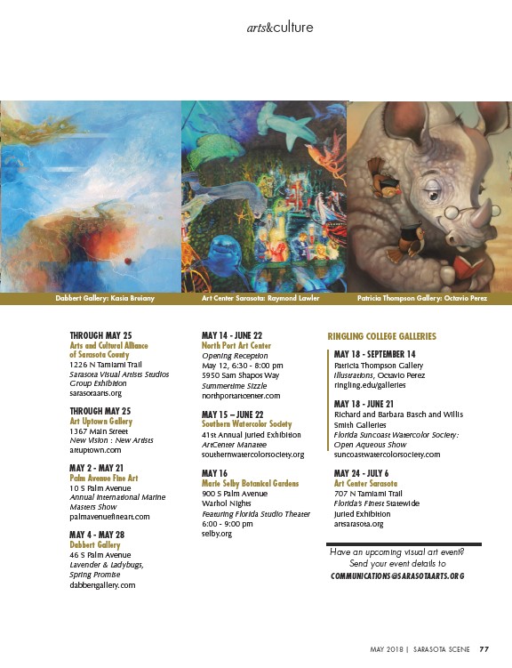 Dabbert Gallery: Kasia Bruiany Art Center Sarasota: Raymond Lawler Patricia Thompson Gallery: Octavio Perez