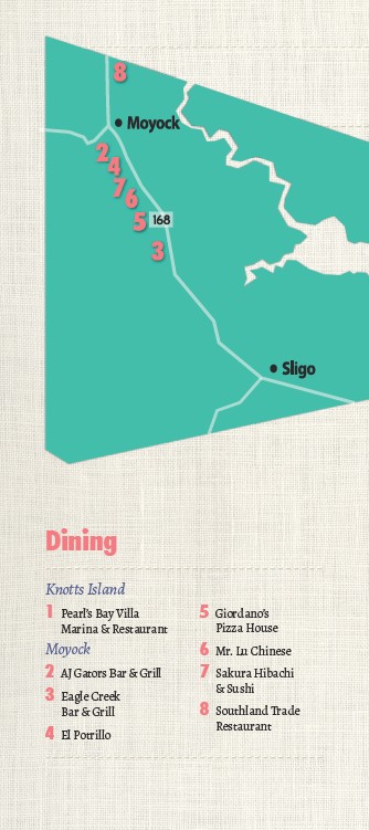 Dining Knotts Island 1 Pearl’s Bay Villa Marina & Restaurant Moyock 2 AJ Gators Bar & Grill 3 Eagle Creek Bar & Grill 4 El Potrillo 5 Giordano’s Pizza House 6 Mr. Lu Chinese 7 Sakura Hibachi & Sushi 8 Southland Trade Restaurant