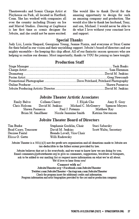Jobsite Theater is a 501(c)(3) not-for-pro t arts organization and all donations made to Jobsite are