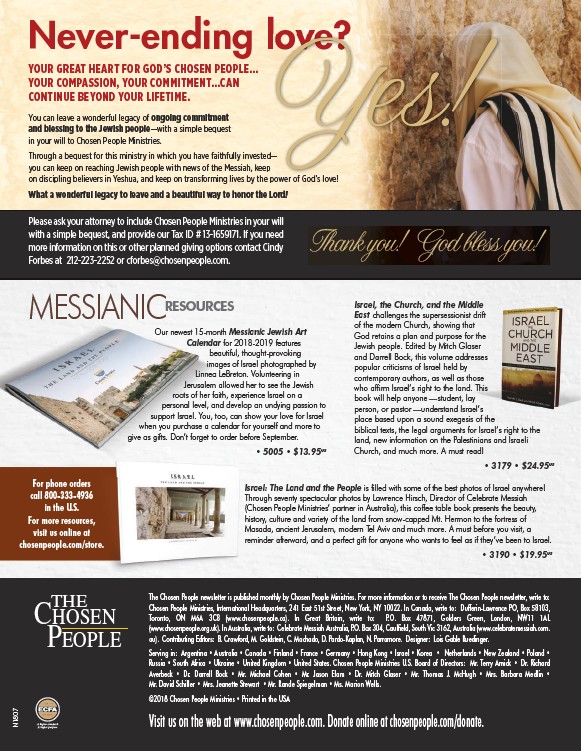 The Chosen People newsletter is published monthly by Chosen People Ministries. For more information or to receive The Chosen People newsletter, write to: