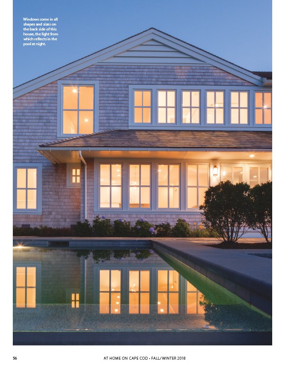 Windows come in all shapes and sizes on the back side of this house, the light from which reflects in the pool at night. AT HOME ON CAPE C 56 OD • FALL/WINTER 2018
