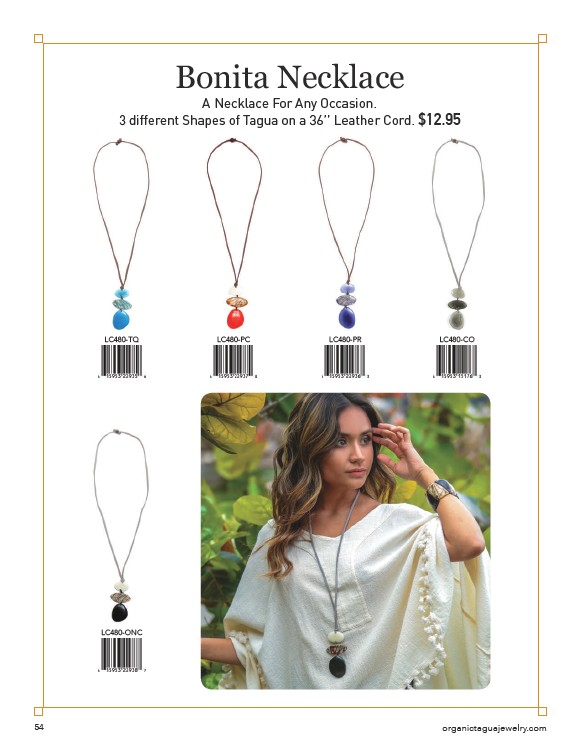 Bonita Necklace A Necklace For Any Occasion. 3 different Shapes of Tagua on a 36’’ Leather Cord. $12.95 LC480-TQ LC480-PC LC480-PR LC480-ONC LC480-CO 54 organictaguajewelry.com