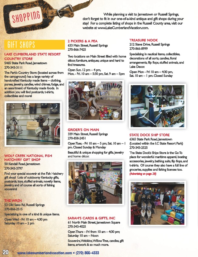 SHOPPING While planning a visit to Jamestown or Russell Springs,