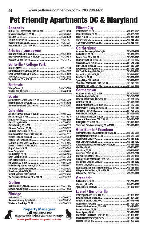 Ashley Apartments, CD to 40#, BR ........................................... 301-498-1105