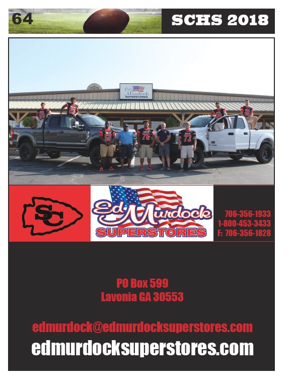 64 SCHS 2018 706-356-1933 1-800-453-3433 F: 706-356-1828 PO Box 599 Lavonia GA 30553 edmurdock@edmurdocksuperstores.com edmurdocksuperstores.com