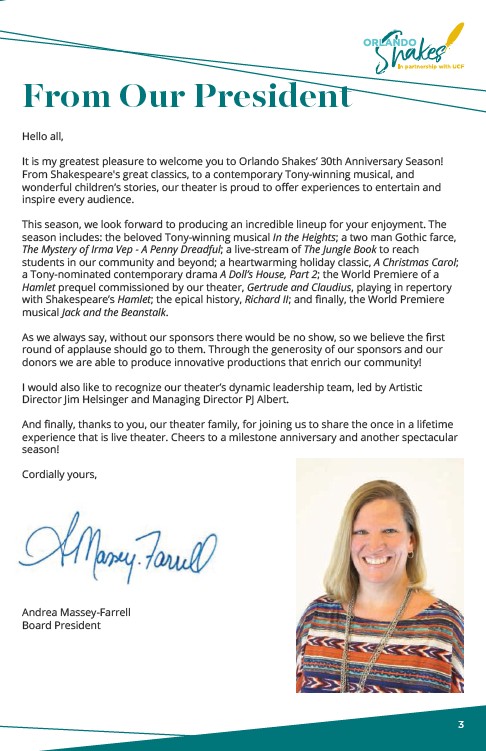 It is my greatest pleasure to welcome you to Orlando Shakes’ 30th Anniversary Season!