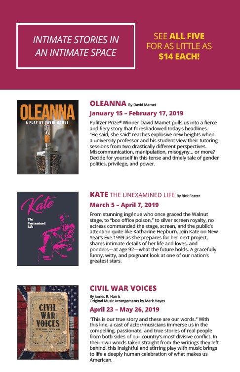 INTIMATE STORIES IN AN INTIMATE SPACE SEE ALL FIVE $14 EACH! The Unexamined Life OLEANNA January 15 – February 17, 2019 ® KATE March 5 – April 7, 2019 CIVIL WAR VOICES April 23 – May 26, 2019
