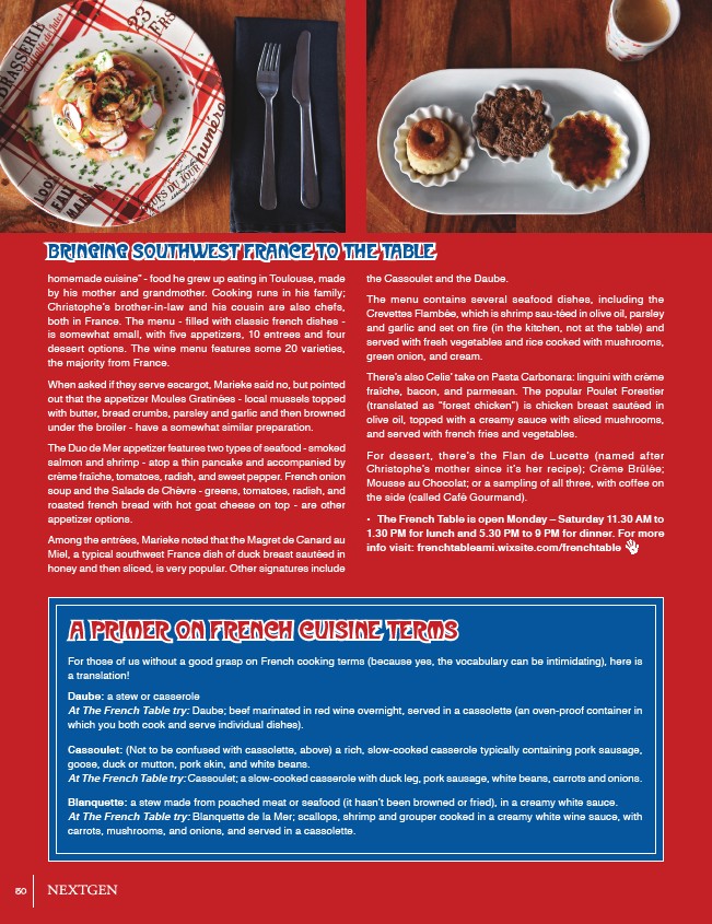 At The French Table try: Cassoulet; a slow-cooked casserole with duck leg, pork sausage, white beans, carrots and onions.