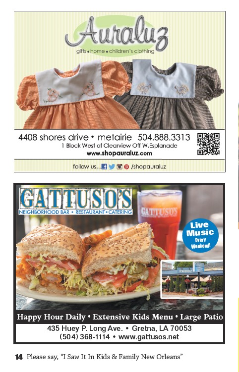 435 Huey P. Long Ave. • Gretna, LA 70053 (504) 368-1114 • www.gattusos.net Please s 14 ay, “I Saw It In Kids & Family New Orleans” Live Music Ever y Weekend! Happy Hour Daily • Extensive Kids Menu • Large Patio