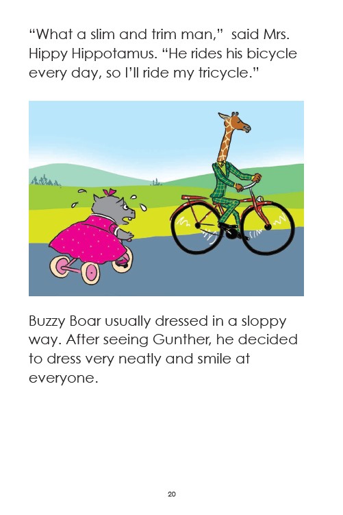 “What a slim and trim man,” said Mrs. Hippy Hippotamus. “He rides his bicycle every day, so I’ll ride my tricycle.” Buzzy Boar usually dressed in a sloppy way. After seeing Gunther, he decided to dress very neatly and smile at everyone. 20