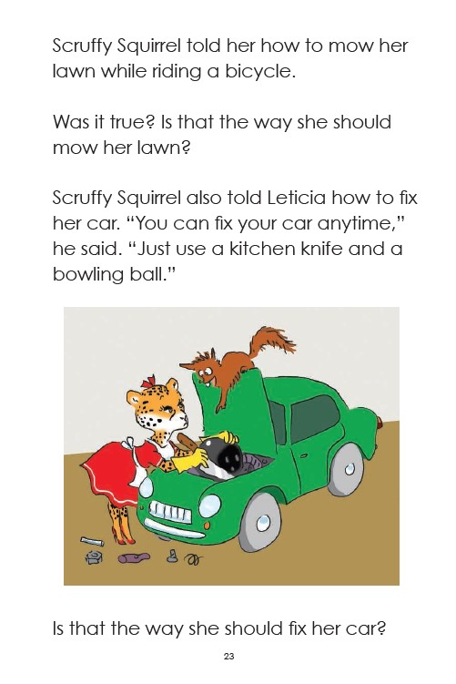 Scruffy Squirrel told her how to mow her lawn while riding a bicycle. Was it true? Is that the way she should mow her lawn? he said. “Just use a kitchen knife and a bowling ball.” 23
