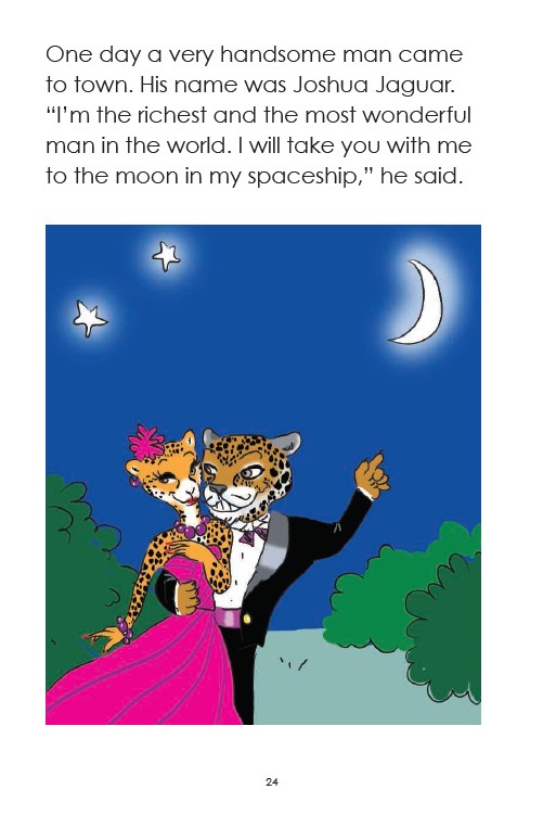 One day a very handsome man came to town. His name was Joshua Jaguar. “I’m the richest and the most wonderful man in the world. I will take you with me to the moon in my spaceship,” he said. 24