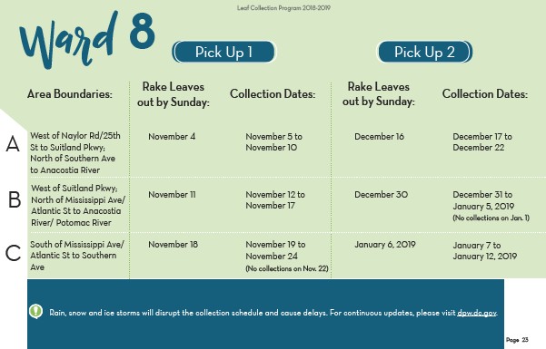 Rain, snow and ice storms will disrupt the collection schedule and cause delays. For continuous updates, please visit dpw.dc.gov.