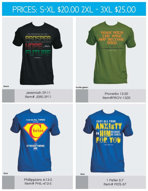 Prices: S-XL $20.00 2XL - 3XL $25.00 Proverbs 13:20 Item#PROV-1320 hunter green Phillippians 4:13-S Item# PHIL-413-S blue 1 Peter 5:7 Item# PETE-57 blue black Jeremiah 29:11 Item# JERE-2911
