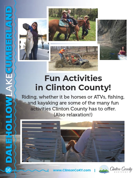 Fun Activities in Clinton County! Riding, whether it be horses or ATVs, fishing, and kayaking are some of the many fun activities Clinton County has to offer. (Also relaxation!) 16 | www.ClintonCoKY.com |