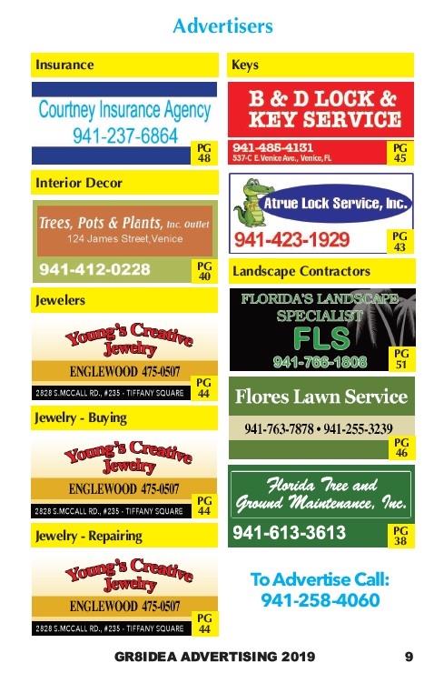 Advertisers Insurance Keys Interior Decor GR8IDEA ADVERTISING 2019 9 Jewelers Jewelry - Buying PG 48 PG 40 PG 45 PG 43 PG 44 PG 44 Jewelry - Repairing PG 44 Landscape Contractors PG 51 PG 46 PG 38 To Advertise Call: 941-258-4060