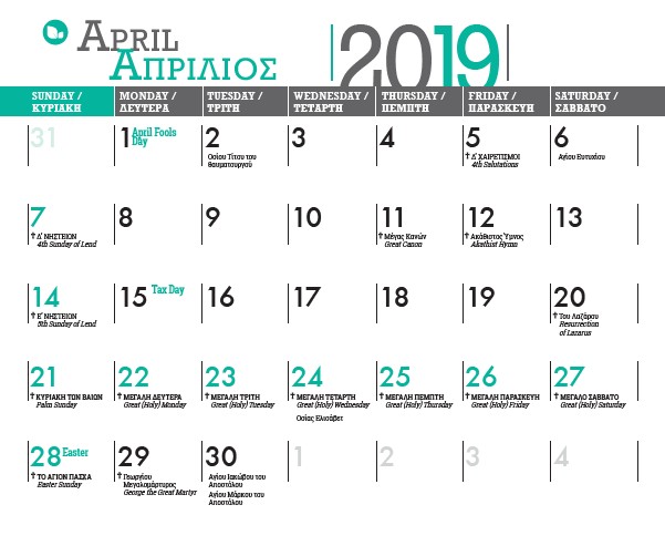 APRIL 2019 31 1 April Fools Day 2 3 4 5 6 7 8 9 10 11 12 13 14 15 Tax Day 16 17 18 19 20 21 22 23 24 25 26 27 28 Easter 29 30 1 2 3 4 SUNDAY / TUESDAY / THURSDAY / MONDAY / WEDNESDAY / FRIDAY / SATURDAY /