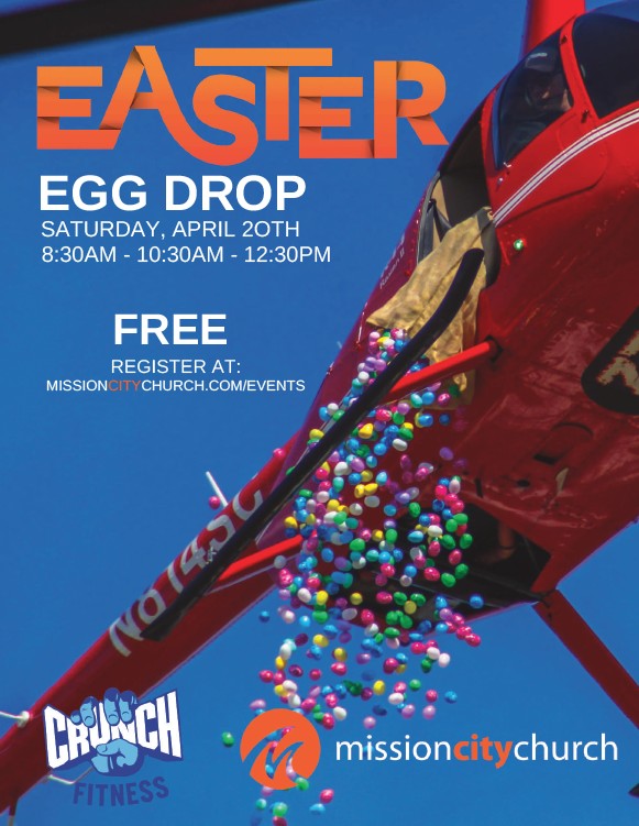 EGG DROP SATURDAY, APRIL 2OTH 8:30AM - 10:30AM - 12:30PM FREE REGISTER AT: MISSIONCITYCHURCH.COM/EVENTS