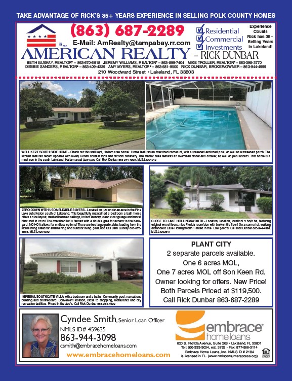 BETH GUSKAY, REALTOR® – 863-670-6918 JEREMY WILLIAMS, REALTOR® – 863-899-7404 MIKE TROLLER, REALTOR® – 863-398-3770 DEBBIE SANDERS, REALTOR® – 863-409-4229 AMY MYERS, REALTOR® – 863-581-9500 RICK DUNBAR, BROKER/OWNER – 863-944-4999