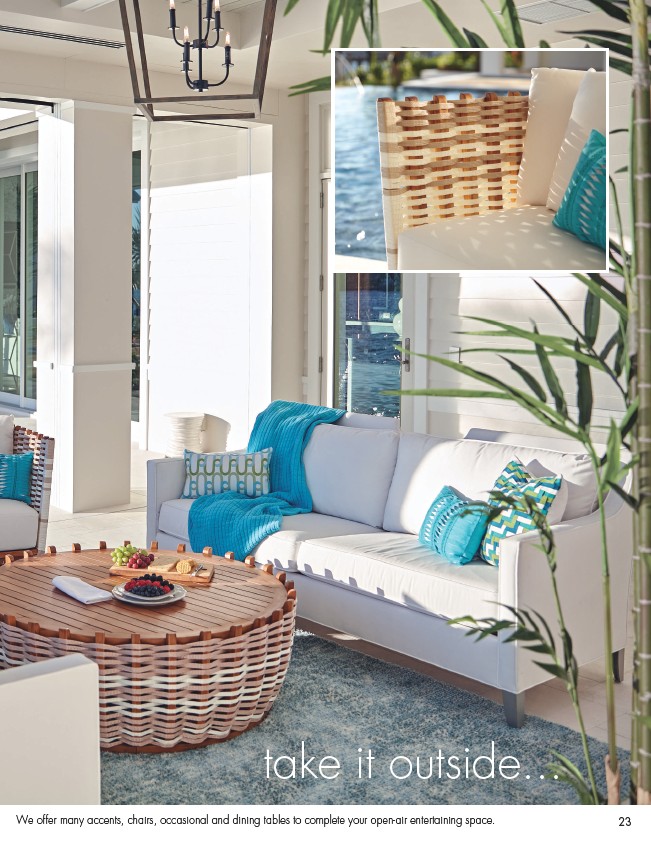 take it outside... We offer many accents, chairs, occasional and dining tables to complete your open-air entertaining space. 23