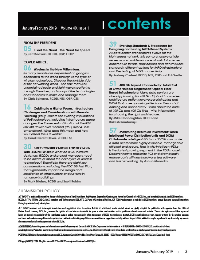 ICT TODAY is published bimonthly in January/February, March/April, May/June, July/August, September/October, and November/December by BICSI, Inc., and is mailed Standard A to BICSI members,