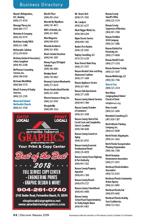 98 | Discover Nassau 2019 Businesses listed are members of the Nassau County Chamber of Commerce.